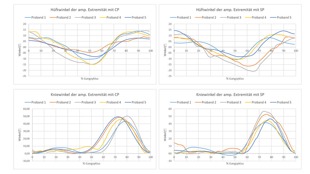 Ein weiterer Parameter der Ganganalyse stellt die Symmetrie dar. Typisch für die betrachtete Studiengruppe ist eine Asymmetrie der Schrittlänge, wobei die betroffene Seite deutlich weiter nach vorne geschwungen wird, um möglichst wenig belastet zu werden. Dies konnte bei allen fünf Studienteilnehmenden mit Silikonversorgung festgestellt werden. Die Prothesenversorgung aus Silikon ist materialbedingt nicht in der Lage, den für das Abstoßen notwendigen Vorfußhebel zu generieren, wodurch Betroffene zum frühzeitigen Beenden des Schrittes gezwungen werden. Bei den Probanden 1 bis 3 wurde mit der CP eine teilweise deutlich verbesserte Schrittlängensymmetrie gemessen (Tab. 1). Bei Proband 5 waren die Parameter mit beiden Prothesen annährend identisch. Proband 4 zeigte wie schon bei der Körperschwerpunktverlagerung eine negative Tendenz mit der CP. Die kinematischen Parameter Hüft- und Kniewinkel (Abb. 5) zeigen generell eine große Streuung von Amplitude und Timing. Für die Probandengruppe deutet dies auf eine sehr variable Einleitung und Durchführung des Schrittes hin. Bei der Analyse des Kniewinkels mit der SP zeigt sich mit der fehlenden Flexion in der mittleren Standphase (bei ca. 25 % des Gangzyklus) ein weiteres typisches Muster vor- und mittelfußamputierter Betroffener – das ‚stelzenartige‘ Gangbild, bei dem das Knie während des kompletten Schrittes durchgestreckt bleibt. Das Tragen der CP wirkt diesem Trend bei den Probanden 2 und 5 eindeutig entgegen. Beide Studienteilnehmenden flektieren während der mittleren Standphase das Knie. Bei den weiteren Probanden liegt zwar eine Tendenz, jedoch keine zweifelsfrei erkennbare Verbesserung vor. Das Erscheinen der leichten Flexion könnte auch durch die Überlagerung der beiden aufgenommenen Messungen erklärbar sein. Auf die Auswertung des Sprunggelenkwinkels wurde in dieser Studie verzichtet. Um die für die dynamische Fortbewegung notwendigen Hebel erforderliche Widerstandsfähigkeit aufbringen zu können, schränkt die CP die Beweglichkeit im Sprunggelenk stark ein.