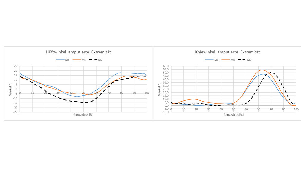 Aufgrund der Tatsache, dass die Langzeituntersuchungen TS2a und TS2b mit großen zeitlichen Aufwänden verbunden waren, hat sich nur Proband 3 bereit erklärt, daran teilzunehmen. Mit dem Ziel, einen kontinuierlichen Lerneffekt während des Tragens der CP erzielen und beobachten zu können, wurden die Messungen der Initialstudie im Vier-Wochen-Rhythmus über eine Dauer von sechs Monaten wiederholt und analysiert. Aus Gründen einer möglichen Überlastung wurde auf die Untersuchungen mit der SP verzichtet. Die Ergebnisse der Langzeitstudie TS2a ermöglichen keine eindeutige Aussage über die Effekte der Carbonprothese auf das Gangbild. Einige weisen eine deutliche Verbesserung auf, andere bleiben gleich oder verschlechtern sich leicht. Die Abb. 6 (links) zeigt die Wohlfühlganggeschwindigkeit. Dabei werden die einzelnen Messintervalle M1 bis M5 der Initialmessung M0 gegenübergestellt. Die Auswertung der Geschwindigkeit zeigt eine eindeutig positive Entwicklung im Vergleich zu M0. Zu allen Analysezeitpunkten konnte ein Wert größer 4,0 km/h erzielt werden. Des Weiteren zeigen die Messdaten eine nicht konstant zunehmende Geschwindigkeit. Nach den erreichten Spitzenwerten während M2 und M4 folgte ein Abfall fast auf das M0-Niveau. Nichtsdestotrotz zeigt die CP in diesem Fall mit einer durchschnittlichen Geschwindigkeitssteigerung um 1,16 km/h eine positive Wirkung. In Einzelfällen sogar so weit, dass Proband 3 in ein schnelleres Gehen bzw. Walken übergegangen ist, was zuvor mit der SP nicht möglich war. Die seitliche Verlagerung des Körperschwerpunktes variiert stark zwischen den Einzelmessungen. Es zeigt sich, dass Proband 3 bei eher moderateren Geschwindigkeiten im Bereich von 4,0 bis 4,3 km/h dazu tendiert, den Körperschwerpunkt nach rechts und bei höheren Geschwindigkeiten zu den Zeitpunkten M1, M2 und M4 nach links zu verlagern. Dieser Trend konnte trotz der gleichen bzw. nicht wechselnden Prothesenkonfiguration beobachtet werden. Als Grund für dieses Phänomen wurden neben dem tagesabhängigen Gemütszustand, die über Jahre angeeignete, durch die Amputation verursachte pathologische Gangbiomechanik ausgemacht. Proband 3 tendiert bei einer schnelleren Fortbewegung zu einer Überkompensation. In Bezug auf die Schrittlängensymmetrie (Tab. 3) ergab die Parameterauswertung ein eher negatives Bild. Abgesehen von einer leichten Verbesserung zum Zeitpunkt M1 wurde die Asymmetrie eher vergrößert. Eine eindeutige Beziehung zwischen hoher Geschwindigkeit und schlechter Symmetrie konnte aus den ausgewerteten Daten nicht erkannt werden. Der größte Unterschied zwischen der betroffenen und gesunden Seite wurde bei der maximalen Geschwindigkeit während M4 ermittelt. Die Analyse des Hüft- und Kniewinkels wurde auf die Messungen M3 und M5 limitiert (Abb. 7). Diese wurden bei einer annährend gleichen Geschwindigkeit aufgenommen und sind somit mit M0 vergleichbar. Eine Gegenüberstellung der Ergebnisse des schnellen Gehens bzw. Walkens mit denen des ‚normalen‘ Gehens würde durch die höheren Maxima und gestauchten Kurvenverläufe bei höheren Geschwindigkeiten das Gesamtbild verfälschen. Die Betrachtung des Hüftwinkels der Messzeitpunkte M0, M3 und M5 zeigt einen ähnlichen Verlauf. Der Offset und die Unterschiede in der Amplitude können mit Hilfe der 3D-Videoanalyse erklärt werden. Das Anbringen der Marker an den entsprechenden Gelenkpunkten zur Visualisierung kann anwenderbedingt variieren und dadurch einen geringfügigeren Offset der Daten erzeugen. Beim Kniewinkel war Proband 3 bereits während der Initialuntersuchung (M0) mit der fehlenden Flexion in der mittleren Standphase auffällig. Dieser Trend setzte sich bei M3 fort. Der Kurvenverlauf für M5 im Bereich 10 bis 20 % des Gangzyklus zeigt eine Flexion und könnte auf das Vorhandensein der Stoßdämpfung sowie einen möglichen Lerneffekt beim Tragen der CP hindeuten. Da M5 jedoch den letzten Messzeitpunkt darstellt, konnte diese Aussage im Rahmen der Studie nicht bestätigt werden.