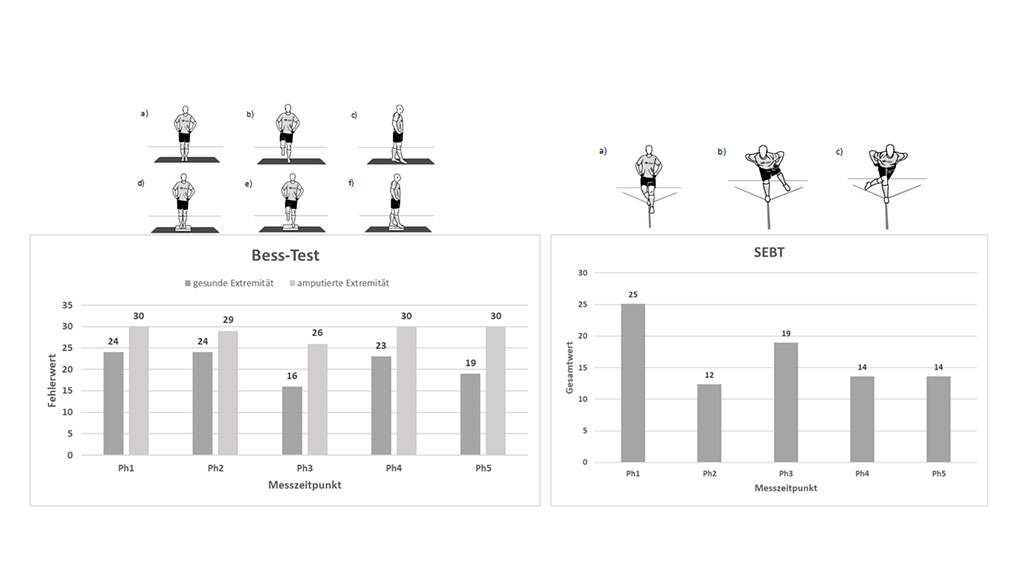 Zusätzlich zur instrumentierten Datenakquise wurde mit Hilfe eines speziell entwickelten Fragebogens der subjektive Eindruck der Studienteilnehmenden bezüglich der jeweiligen Prothese erfasst. Dieser umfasste die Bewertung des Sicherheitsgefühls während der Fortbewegung, den bequemen Sitz sowie das äußere Erscheinungsbild der Prothese. Mit einem Teilnehmenden erfolgte eine Langzeituntersuchung (TS2a) über einen Zeitraum von sechs Monaten mit Messdatenerhebungen im Vier-Wochen-Rhythmus. Diese wurde von einer Physiotherapeutin (TS2b) begleitet, um dem Teilnehmenden bei der Eingewöhnung mit einem speziell entwickelten Trainingskonzept zu unterstützen. Zusätzlich wurden der muskuläre sowie der Gleichgewichtszustand mittels Balance-Error-Scoring-System (Bess) sowie Star-Excursion-Balance-Test (SEBT) erfasst. Beide Tests sind Standardmethoden in der Physiotherapie. Bei der Silikonprothese wurde auf die Aufzeichnung der Gangdaten verzichtet, da diese materialbedingt nicht in der Lage ist, die notwendige Widerstandskraft zu erbringen, um den dynamischen Belastungen standzuhalten. Entsprechend würde das Ausführen der Übungen mit dem Silikonhilfsmittel in hohen Kräften auf den Stumpf und dadurch in Schmerzen resultieren. Im Gegensatz dazu wurde in einer weiteren Publikation bereits die Eignung der Carbonprothese für sportliche Aktivitäten untersucht19.