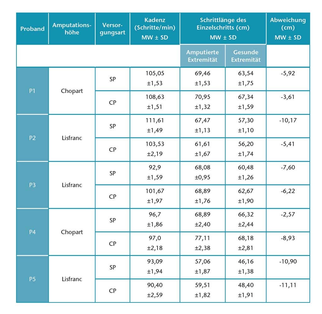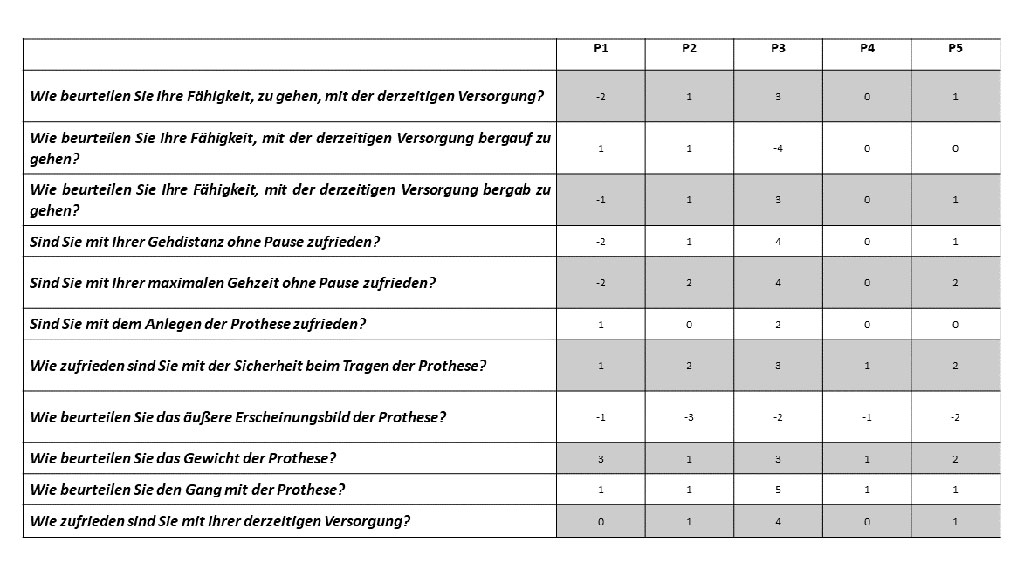 Ein weiterer Aspekt der Studie war der subjektive Eindruck der Studienteilnehmenden. Diese wurden gebeten, anhand einer Sieben-Punkte-Skala bestimmte Fähigkeiten sowie ihre Eindrücke beim Tragen beider Prothesen zu bewerten. Dabei steht der Wert 1 für ‚gar nicht zufrieden‘ und der Wert 7 entsprechend für ‚sehr zufrieden‘. Tab. 2 zeigt die Differenz der Einzelauswertungen. Eine negative Zahl bedeutet ein besseres Ergebnis für die SP; entsprechend eine positive Wertung ein besseres Ergebnis für die CP. Auffällig ist, dass Proband 1 die CP deutlich kritischer bewertet hat als die restlichen Probanden. Die Aspekte bezüglich der Sicherheit beim Gehen, der maximalen Gehdistanz sowie dem Gang an sich, wurden bei der CP zum Teil deutlich höher bewertet. Dies spiegelt auch die Auswertung der Gangparameter der instrumentierten Ganganalyse wider, bei der die CP größtenteils besser ausfiel. Im Hinblick auf die Kosmetik sowie das Aussehen schneidet die SP besser ab. Aus der Auswertung geht zudem hervor, dass keiner der Probanden die CP insgesamt schlechter bewertet hat. Bei den Probanden 1 und 4 fällt die Allgemeinwertung neutral aus. Die Probanden 2 und 5 evaluieren leicht und Proband 3 stark zugunsten der CP.