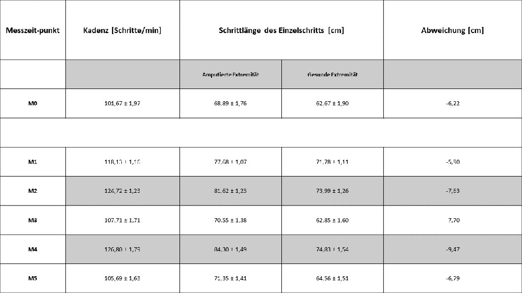 Limitierend muss erwähnt werden, dass es sich bei der Probandengruppe um eine kleine Studienpopulation handelt, deren Amputation vor etwa zwei Jahrzehnten erfolgte. Hier überwiegt der negative Einfluss der nicht optimalen prothetischen Versorgung, wodurch die Biomechanik im Rahmen der Initial- oder Langzeituntersuchung nur teilweise korrigiert werden konnte. Die Umstellung auf ein geeignetes Hilfsmittel zur Rekonstruktion der verlorenen Gangbiomechanik und Wiederherstellung des erforderlichen Vertrauens in eine sichere Fortbewegung benötigt in der Regel viel Zeit und sollte so früh wie möglich nach der Amputation erfolgen.