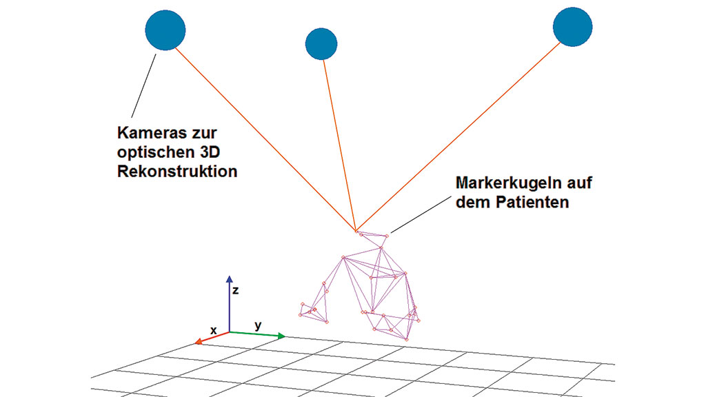 Voraussetzung zur Teilnahme an der Studie ist die passgerechte Versorgung und therapeutische Gebrauchsschulung mit beiden Schaftsystemen. Das bestehende Schaftsystem wird vorab auf seine Passform überprüft. Sofern Teilnehmer der Studie mit nur einem der zu vergleichenden Schaftsysteme versorgt sind, erhalten sie eine Anpassung und Gebrauchsschulung mit dem zweiten Schaftsystem. Es findet eine dreidimensionale optische Erfassung der Kinematik mittels eines Vicon-Systems (Oxford Metrics, Oxford, UK) statt. Eine Auswertung der Daten geschieht durch das biomechanische Oberkörpermodell von Oliver Rettig et. al. 1. Reflektierende Marker werden an festgelegten prominenten anatomischen Merkmalen platziert (Abb. 3) und über ein Kameraarray dreidimensional im Raum erfasst (Abb. 4). Die erfassten Bewegungssegmente werden als Flächen dargestellt, die Ermittlung der Gelenkachsen geschieht mathematisch durch das Oberkörpermodell. So ist eine absolute Erfassung von Bewegungsabläufen und Bewegungsausmaßen möglich.
