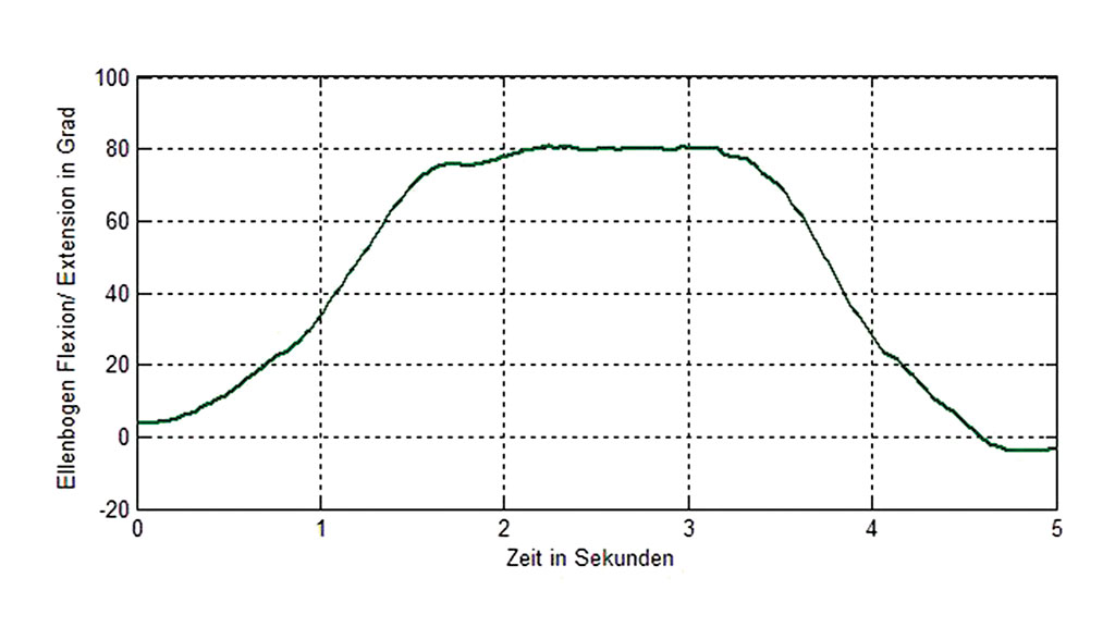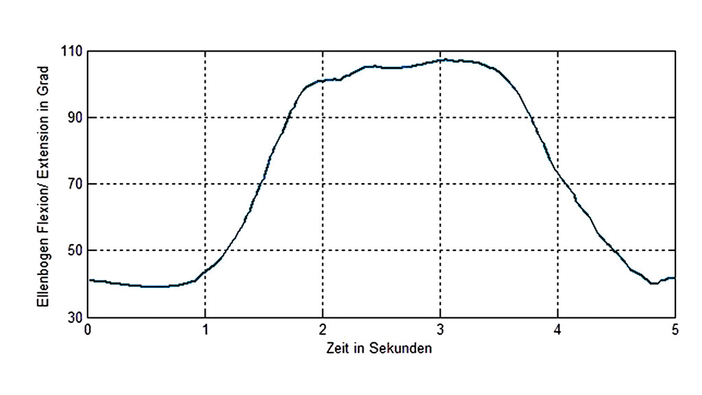 Die bisherigen Ergebnisse hinsichtlich des erarbeiteten Protokolls und der Methode zeigen, dass sie grundsätzlich die funktionellen Aspekte der armprothetischen Versorgung widerspiegeln und damit messbar machen. Die Ergebnisse zweier exemplarischer Untersuchungen werden im Folgenden deskriptiv dargestellt. Es zeichnet sich bereits nach zwei Probanden eine Tendenz bezüglich der Fragestellung zum absoluten Bewegungsausmaß ab. Es ist festzustellen, dass sich die klinischen Beobachtungen in der Messung bestätigen und bei der Versorgung mit einem Silikonschaft ein Zuwachs des Bewegungsausmaßes gegenüber der konventionellen Schaftausführung deutlich wird. Exemplarisch anhand der Messungen eines Probanden dargestellt zeigt sich in Abbildung 5 mit dem rigiden Schaft ein Bewegungsausmaß von 65°. Diesem Bewegungsausmaß stehen 85° mit Silikonschaft gegenüber (Abb. 6). Obwohl in diesem Falle unterschiedliche Kriterien für den Aufbau der beiden Schaftsysteme zur Geltung kamen, wodurch sich die unterschiedlichen Absolutwerte (Mininum und Maximum) nach Neutral Null ergaben, so nähert sich mit dem Silikonschaft das Bewegungsausmaß mit einem Zuwachs von 20° in jedem Falle dem physiologischen Bewegungsumfang von etwa 150° an.