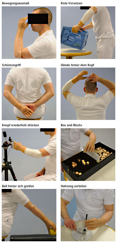 Neben den messtechnisch erfassten Bewegungsabläufen werden zudem Funktionstests aus dem klinischen Versorgungsalltag und der Ergotherapie durchgeführt. Die sichere Ansteuerung etwa im Schürzengriff oder über dem Kopf ist nur mit einer akkuraten Passform möglich und lässt Erkenntnisse über eine insuffiziente Ansteuerung durch Verhebelungen im Schaft zu. Routinen wie Handtücher falten, einen Reissverschlussbeutel öffnen oder Übungen wie der Box-and-Blocks-Test 3 lassen, insbesondere bei einem direkten Vergleich der Schaftsysteme, Aussagen über eine sichere Ansteuerung, ein bimanuelles Arbeiten, zeitliche Komponenten und die Feinpositionierung zu.