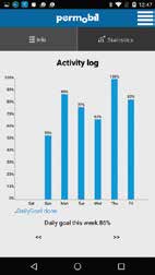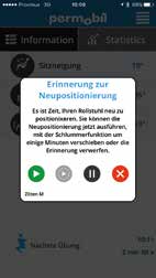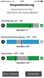 Erin­ne­run­gen wer­den aus­ge­ge­ben, solan­ge der Roll­stuhl ein­ge­schal­tet ist. Der Nut­zer kann die Erin­ne­run­gen ver­schie­ben oder löschen, wenn eine Hal­tungs­än­de­rung zum Aus­ga­be­zeit­punkt unpas­send ist. Die App ori­en­tiert den Nut­zer beim Ein­stel­len der emp­foh­le­nen Posi­ti­on. Sie belohnt den Nut­zer mit posi­ti­ven Rück­mel­dun­gen, wenn der Plan ein­ge­hal­ten wird, und ermög­licht es ihm, sei­ne Gesund­heit eigen­stän­dig zu mana­gen. Das Smart­phone wird über eine mobi­le Netz­werk- oder WLAN-Ver­bin­dung alle 30 Minu­ten mit der Cloud syn­chro­ni­siert. Die Com­pli­ance wird in der Cloud pro­to­kol­liert, und der Behand­ler kann die Daten über das web­ba­sier­te Tool ein­se­hen und beob­ach­ten. Wochen- oder monats­wei­se kön­nen Sta­tis­ti­ken zur Regel­be­fol­gung ange­zeigt werden.