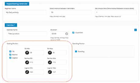 Der Behand­ler rich­tet über ein web­ba­sier­tes Tool für jeden Nut­zer einen indi­vi­du­el­len Sitz­plan ein, der Ein­stel­lun­gen für Sitz- und Rücken­leh­nen­nei­gung und Bein­stüt­zen umfasst (Abb. 2). Der Plan kann ver­schie­de­ne Übungs­ar­ten ent­hal­ten, die auf den All­tag in Beruf und Aus­bil­dung und ande­re Akti­vi­tä­ten abge­stimmt sind. Der Plan rich­tet sich nach den kli­ni­schen Emp­feh­lun­gen, wird aber indi­vi­du­ell an All­tag und Mög­lich­kei­ten des Nut­zers ange­passt, um Umsetz­bar­keit und Bedien­freund­lich­keit zu ver­bes­sern. Dem Behand­ler kommt eine wich­ti­ge Rol­le dabei zu, den Nut­zer über die Risi­ken von Fol­ge­er­kran­kun­gen und die rich­ti­ge Ver­wen­dung elek­tri­scher Sitz­funk­tio­nen zur Prä­ven­ti­on von Fol­ge­er­kran­kun­gen zu infor­mie­ren 3839. Um Scher­kräf­te zu ver­mei­den, muss vor dem Ver­stel­len der Rücken­leh­ne der Sitz aus­rei­chend geneigt werden.