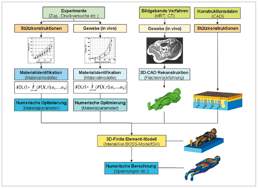 Auf Basis dieser experimentellen Befunde werden dann mithilfe kontinuumsmechanischer Materialgleichungen und geeigneter numerischer Optimierungsalgorithmen die Materialparameter determiniert (Materialidentifikation) 3 4 5 6 7 8 9 10. Sämtliche digitalisierten Daten der o. g. drei Blöcke münden dann in ein numerisches „Gesamt-Tool“ in Form eines FE-Modells, mittels dessen das sehr komplexe und dreidimensionale mechanische Interaktionsgeschehen zwischen Person und jeweiligem Hilfsmittel berechnet und simuliert werden kann. Dies ermöglicht eine genaue Analyse der Spannungs‑, Verzerrungs- bzw. Verformungsverteilungen im Inneren der Fett-Gewebe-Muskel-Verbünde bis hin zu den jeweiligen Knochenstrukturen beim Liegen oder Sitzen infolge der Interaktion etwa mit Liege- bzw. Sitzsystemen. Darüber hinaus kann schließlich eine Optimierung von Geometrie und Material des Hilfsmittels unter Berücksichtigung eines Optimierungskriteriums (etwa minimale Spannungen an exponierten Knochenstrukturen) erfolgen.