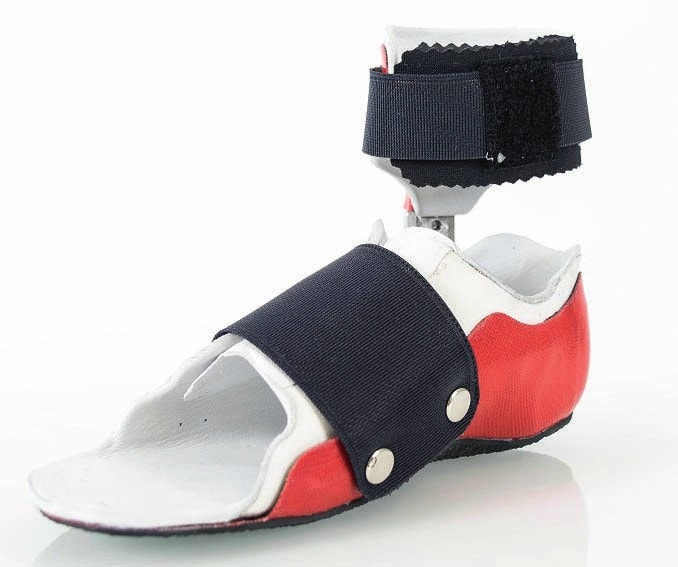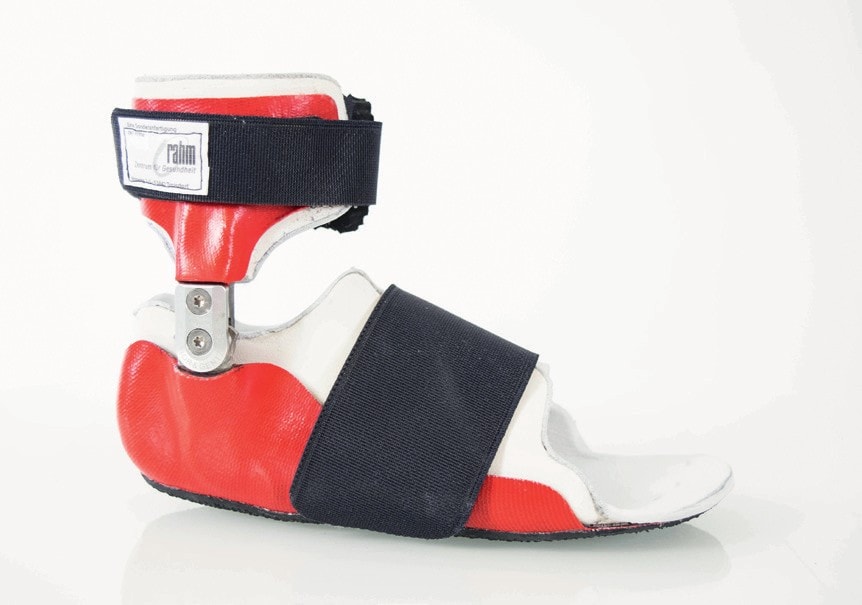 Die Verbindung der Fußorthese zur Unterschenkelführung erfolgt durch ein unilaterales Gelenk, das im Bewegungsausmaß individuell begrenzbar ist (Abb. 6). Die Dimensionierung der dabei verwendeten Gelenke richtet sich nach der Körpergröße und dem Gewicht des Patienten sowie nach seinem Aktivitätsgrad und der Schuhgröße. Dabei muss das zu erwartende Wahstum des Kindes brücksichtigt werden. Flexible Verschlüsse ermöglichen eine gute Anpassung bei gleichzeitig gutem Halt. Ein Sohlenaufbau von plantar ist nicht notwendig, sodass die Orthese bei normalen Fußproportionen auch im Konfektionsschuh getragen werden kann.