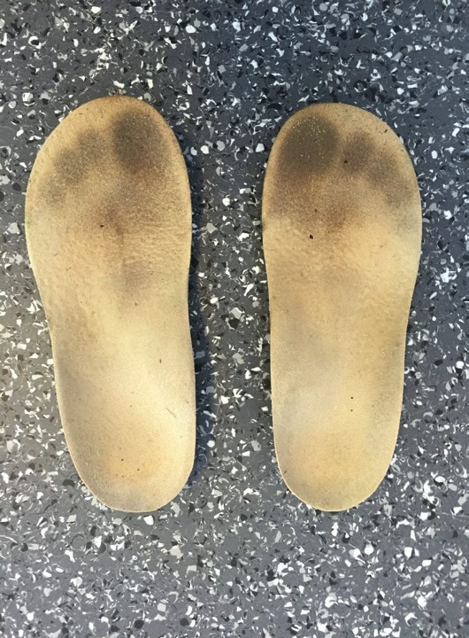 Gelingt es dem Patienten nicht, über diese Maßnahme die Fußmuskulatur ausreichend zu aktivieren, schaukelt sich der Fuß auf der medialen Längsgewölbeabstützung auf, sodass sich bei der Abrollung („mid stance“ zu „terminal stance“) das Fersenbein aus der Fersenmulde heraushebt. Erkennbar ist das an den fehlenden Belastungsspuren auf getragenen Einlagen (Abb. 3a u. b). Benötigt die Fußkorrektur zusätzlich zum plantaren Korrekturdruck noch eine seitliche Führung, wird ergänzend zu den Einlagen ein Therapiestabilschuh angewendet.