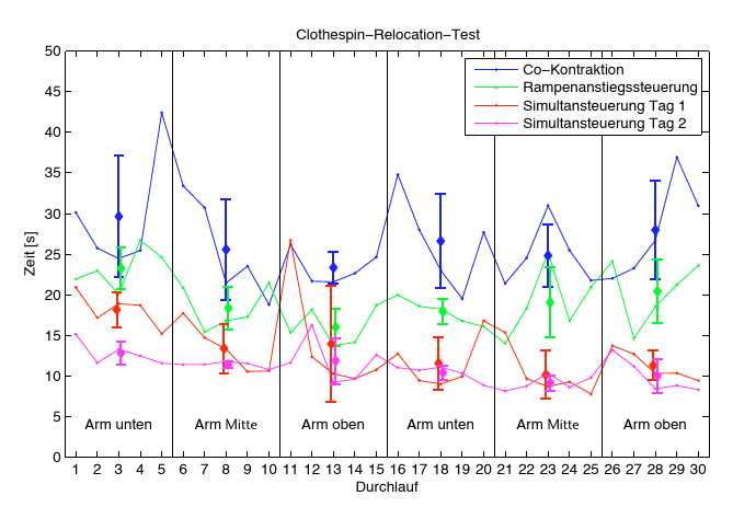 Die Co-Kontraktionssteuerung war am langsamsten, was damit begründet ist, dass ein Umschalten zwischen Greifen und Rotation notwendig ist. Die Rampenanstiegssteuerung, bei der kein Umschalten notwendig ist, schnitt deutlich besser ab. Auch bei den konventionellen Steuerungen war keine Verschlechterung durch eine Veränderung der Armposition zu beobachten.