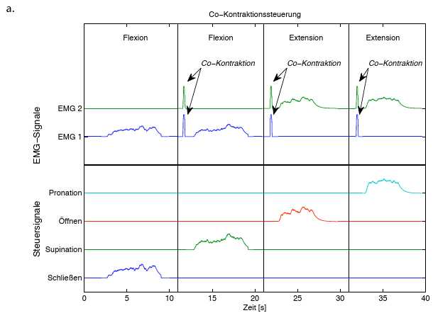 Um mit diesen zwei Elektroden mehrere Freiheitsgrade wie etwa eine zusätzliche Rotation steuern zu können, werden Heuristiken zur Auswahl des jeweiligen Freiheitsgrades verwendet. Bei den am häufigsten verwendeten Methoden erfolgt die Auswahl über eine Co-Kontraktion oder über die Geschwindigkeit, mit der die Kontraktion aufgebaut wird 5. Da die Funktionen immer nur einzeln gesteuert werden können und eine kurze Pause beim Wechsel der Funktion notwendig ist, müssen komplexere Bewegungen in mehrere Teilbewegungen zerlegt werden, die sequenziell ausgeführt werden müssen. Dies a. macht die Benutzung langsam, verhindert einen flüssigen Bewegungsablauf und beschränkt den Nutzen weiterer verfügbarer Freiheitsgrade.