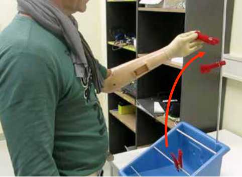 Alle drei Steuerungen wurden mittels des standardisierten Clothespin-Relocation-Tests 18 evaluiert. Dabei muss der Proband in einem Durchlauf möglichst schnell drei Wäscheklammern von einer horizontalen auf eine vertikale Stange versetzen (Abb. 3). Der Proband bekam bei jeder Steuerung die Gelegenheit, diesen Test kurz zu üben, bevor die eigentliche Messung begann. Er wurde gebeten, möglichst keine Ausgleichsbewegungen mit dem Körper zu vollführen, sondern beide Funktionen der Prothese zu verwenden. Um eine Klammer zu versetzen, musste der Proband dazu in den richtigen Winkel rotieren (Pronation), die Klammer greifen, etwa im rechten Winkel supinieren und die Klammer dann durch Handöffnen auf der vertikalen Stange absetzen. Da die Zuverlässigkeit anderer nichtkonventioneller Steuerungen oft durch eine Änderung der Armposition beeinträchtigt wird, wurde der Test in drei unterschiedlichen Höhen durchgeführt (63 cm, 76 cm, 150 cm). Um den Lerneffekt des Probanden sowie zufällige Schwankungen zu berücksichtigen, wurden jeweils fünf Durchläufe in einer Armposition vorgenommen und der gesamte Ablauf zweimal hintereinander durchgeführt.