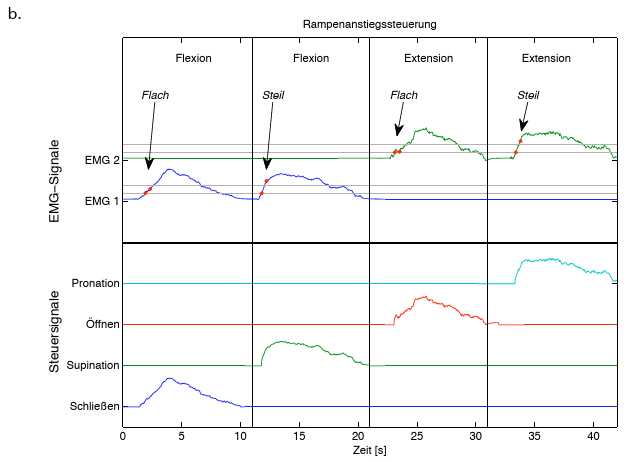 Bei dieser Steuerung kann der Benutzer den Freiheitsgrad der Prothese auswählen, indem er die initiale Anstiegsgeschwindigkeit des EMG-Signals verändert (Abb. 1b). So führt in der Regel eine anfangs langsame Extension/Flexion, die also einen flachen Anstieg der EMG-Aktivität aufweist, zum Öffnen/Schließen der Prothese, wohingegen der Anwender durch einen anfangs steilen Anstieg mit den gleichen, aber schnelleren Muskelbewegungen Prothesensupinationen/-pronationen durchführen kann.