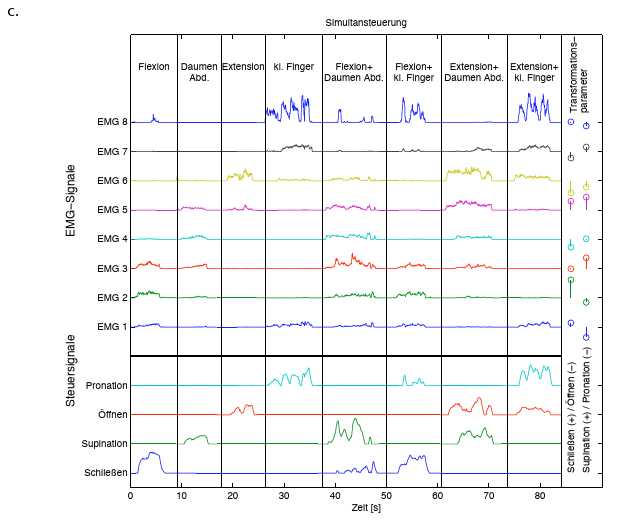 Zusätzlich dazu können beispielsweise die Kontraktionen getestet werden, die mit einer Pronation, Supination, Abduktion oder Adduktion des Handgelenks sowie dem Beugen oder Abspreizen einzelner Finger assoziiert werden. Grundsätzlich ist die Wahl möglichst intuitiver Bewegungen für die jeweils angestrebte Prothesenfunktion wünschenswert. Noch wichtiger ist es jedoch, gut differenzierbare Signalmuster zu wählen, um später eine zuverlässige Kontrolle zu erzielen. Bei regelmäßiger Nutzung einer Steuerung ist zu erwarten, dass auch solche Kontraktionen schnell intuitiv werden, die anfangs nicht mit der Prothesenfunktion assoziiert werden.