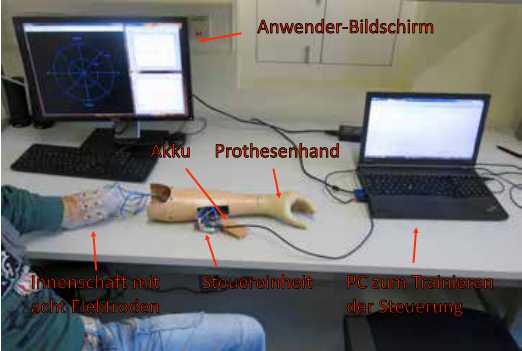 Nach erfolgreichem Training werden die gelernten Transformationsparameter auf der Steuereinheit der Prothese gespeichert. Diese wird dann vom PC abgekoppelt, sodass ein eingebettetes, transportables Prothesensystem entsteht, das unabhängig vom Computer arbeiten kann. Die Steuereinheit transformiert die EMG-Aktivitätssignale mit Hilfe des gelernten Algorithmus in prothetische Steuersignale für das Öffnen und Schließen der Hand sowie für die Rotation des Handgelenks. Zur Erhöhung der Sicherheit können ähnlich wie bei konventionellen Steuerungen Schwellwerte definiert werden, die ungewollte Bewegungen bei geringer Muskelaktivität verhindern. Der Anwender kann dann die beiden Funktionen der Prothese proportional und gleichzeitig steuern, wobei die beiden Geschwindigkeiten (bzw. Rotationsgeschwindigkeit und Griffkraft) bei Simultanbewegungen unabhängig voneinander kontrolliert werden können. Dies erlaubt einen flüssigen Übergang zwischen Einzel- und Simultanbewegungen und führt zu einem sehr natürlichen Erscheinungsbild.