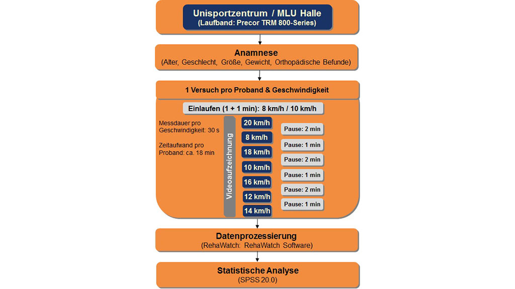Bei 40 Probanden (32 %) lagen in der Vergangenheit orthopädische Befunde vor, die aber zum Zeitpunkt der Untersuchung keinen Einfluss auf das Laufen hatten. Alle Tests fanden im Universitätssportzentrum der MLU Halle-Wittenberg auf dem Laufband „Precor TRM 800-Series“ statt. Die Studie wurde von der Ethik-Kommission der Medizinischen Fakultät der Martin-Luther-Universität Halle-Wittenberg genehmigt.