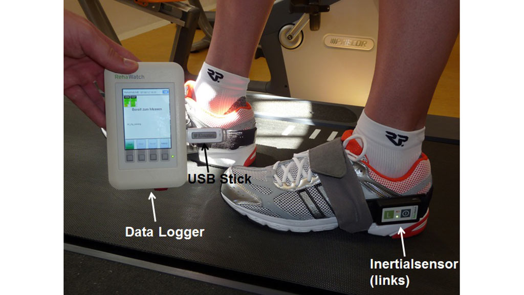 Das mobile Messsystem RehaWatch erfasst Laufparameter mittels Inertialsensoren. Jeder Inertialsensor enthält ein Drei-Achsen-Accelerometer (Messbereich: ± 16 g), ein Drei-Achsen-Gyroskop (Messbereich: ± 2000/s) und ein Drei-Achsen-Magnetometer (Messbereich: ± 1,3 Ga). Die Sensoren sind als MEMS (Micro-Electro-Mechanical System) aufgebaut (Abtastfrequenz: 600 Hz). Die Messdaten werden von den Sensoren via Bluetooth an den Data Logger (Abb. 2a) und von dort mittels USB-Stick (Abb. 2b) an die Analysesoftware im PC übertragen. Die Messung sollte auf hartem Untergrund stattfinden und sollte mindestens acht Doppelschritte beinhalten.