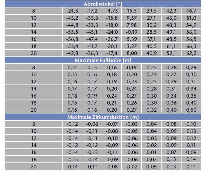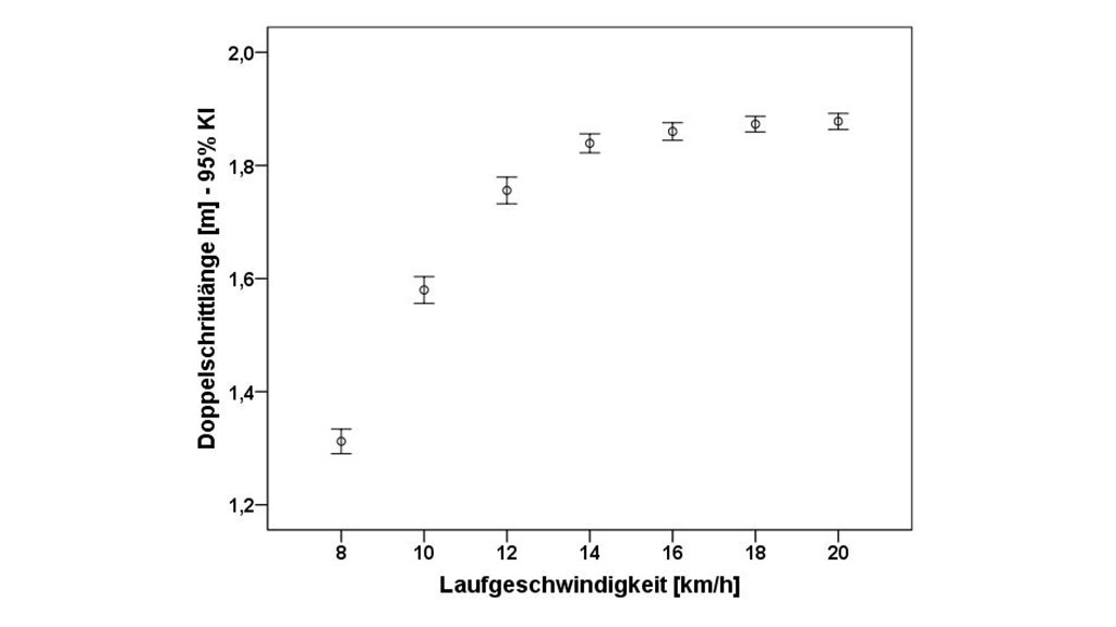 Die Mehrfachvergleiche nach Bonferroni ergaben darüber hinaus für folgende Parameter signifikante Unterschiede zwischen den einzelnen Geschwindigkeitsniveaus (8–20 km/h): Schrittlänge, Schrittdauer, Kadenz, Aufsetz- und Abrollwinkel, maximale Fußhöhe, maximale Zirkumduktion, Schwungphase, Landephase, Stützphase und Abdruckphase.