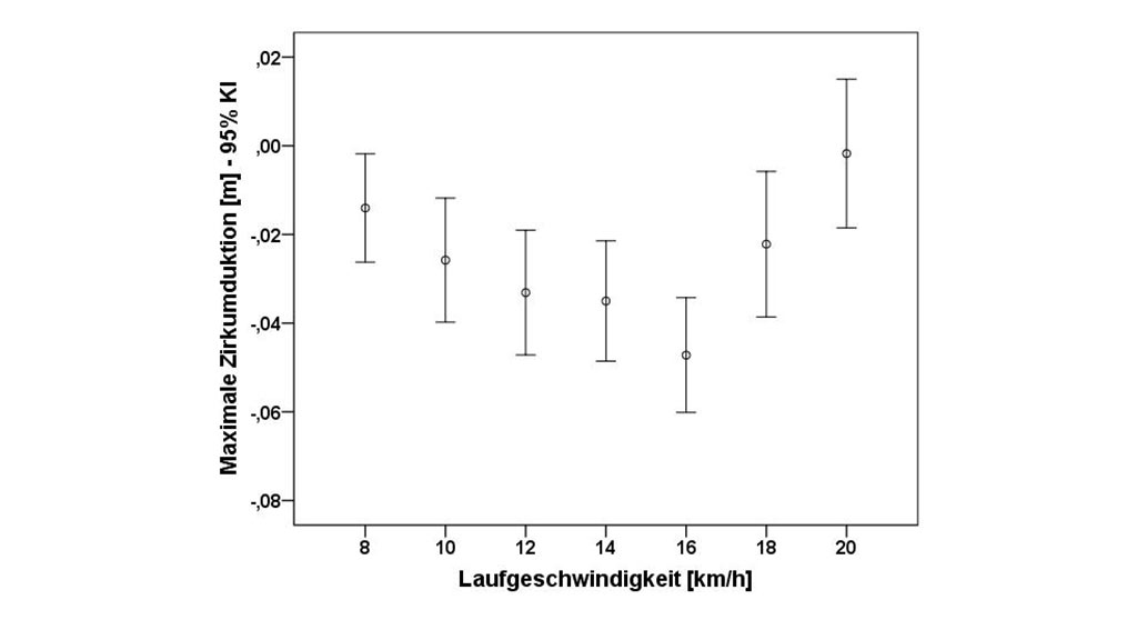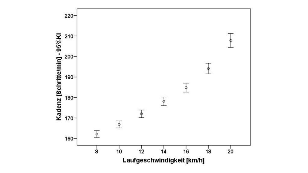 Zunächst wurde mittels Regressionsanalyse (Prozedur: Kurvenanpassung) geprüft, welche Abhängigkeiten (Betrag, Art) zwischen den abhängigen Variablen (Laufparameter) und der unabhängigen Variable „Laufgeschwindigkeit“ bestehen. Darüber hinaus wurde die Geschwindigkeitsabhängigkeit varianzanalytisch (einfaktoriell, univariat) geprüft.