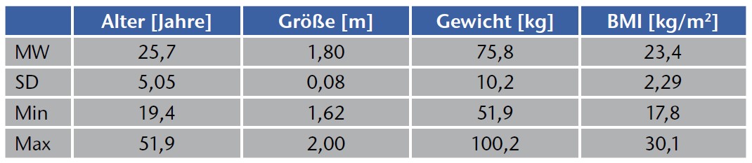 Folgende demografische und anthropometrische Daten wurden darüber hinaus erfasst: Alter, Geschlecht, Größe, Gewicht, orthopädische Befunde.
