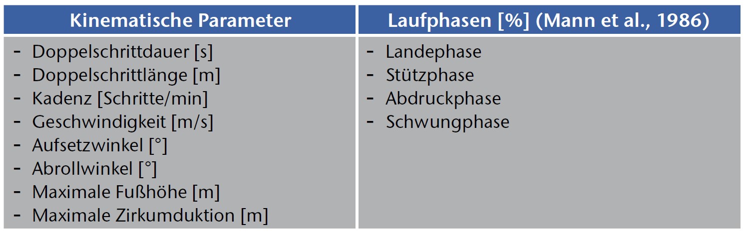 In der RehaWatch-Analysesoftware werden die Messdaten automatisch ausgewertet. Grundlage ist die Bestimmung von vier Laufereignissen (initialer Bodenkontakt, vollständiger Fußaufsatz, Fersenablösung und Zehenablösung). Auf der Basis der Laufereignisse werden die räumlichzeitlichen Parameter und Laufphasen, entsprechend der Nomenklatur von Mann et al. 15, abgeleitet (Tab. 2). Die Symmetrie (Links-Rechts-Vergleich bilateraler Parameter) wird nach folgender Gleichung berechnet: