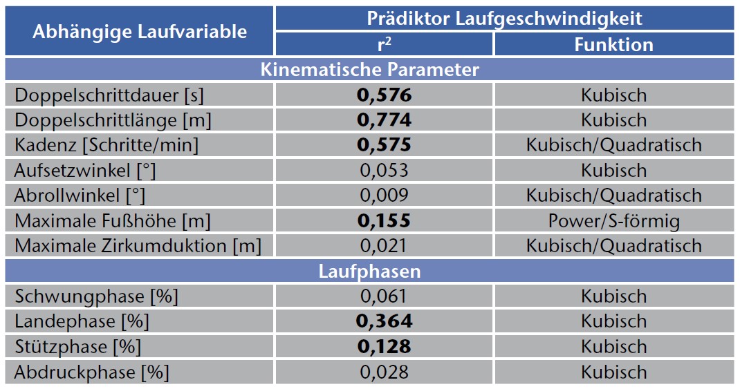 Die Laufgeschwindigkeit beeinflusst insbesondere die räumlich-zeitlichen Parameter (Tab. 3) nachhaltig. In der Regel liegt ein kubischer Zusammenhang vor, ähnlich wie dies für den Bereich des Gehens bereits eruiert werden konnte 16.