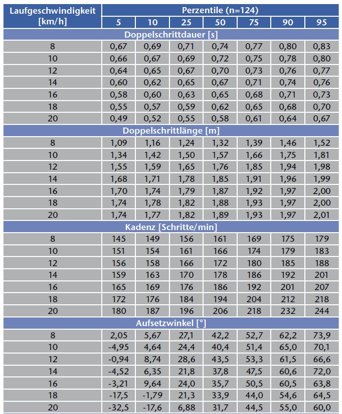 Besitzt der Proband bei einer Laufgeschwindigkeit von 10 km/h eine Doppelschrittlänge von maximal 1,34 m, so gehört er zu den 5 % Probanden mit der niedrigsten Doppelschrittlänge. Hingegen wäre eine Doppelschrittlänge von mindestens 1,81 m (P 95) gleichbedeutend mit der Zuordnung zu jenen 5 % der Probanden mit der größten Doppelschrittlänge.