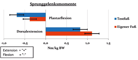 Die plantarflektierenden Momente am Gelenkdrehpunkt des Testfußes waren gegenüber denen des probandeneigenen Prothesenfußes erhöht (negative Vorzeichen ergaben sich systembedingt, da eine Bewegungsrichtung als positive Richtung festgelegt werden musste; Messwerte können als Absolutwerte angesehen werden). Die Momente der Plantarflexion unterschieden sich um fast 50 %. Die dorsalextendierenden Gelenkmomente erwiesen sich beim Testfuß als geringer. Die Unterschiede in der Dorsalextension waren geringer als die in der Plantarflexion.
