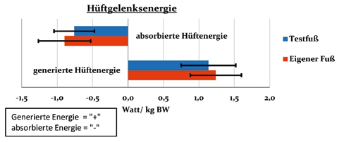 Dieses subjektive Empfinden wird durch die ganganalytischen Ergebnisse im Bereich der Hüftgelenksenergie untermauert. So wurde vom Hüftgelenk beim Einsatz des Testfußes zum Ende der Standphase (ca. 40 bis 50 % des Schrittzyklus 5) im Mittel 15,3 % weniger Energie absorbiert. Das bedeutete für die Fortbewegung des Probanden, dass er 15,3 % weniger Energie bei jedem Schritt zum Abbremsen seiner Masse benötigte. Zudem kam es bei ca. 60 bis 70 % der Schrittabwicklung zur Einsparung von 8,4 % an generierter Hüftenergie. Die Folge war eine Energieersparnis von 8,4 % pro Schritt, um die benötigte Flexion von Knie- und Hüftgelenk zum problemlosen Durchschwingen des Beines zu realisieren. In der Summe ergab sich somit für jeden Schritt eine Energieersparnis von 23,7 %.