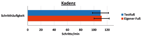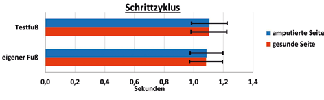 Bei den Zeit-Distanz-Parametern lagen ebenfalls signifikante Unterschiede beim Vergleich der untersuchten Prothesenfüße vor. So machten die Probanden mit dem Testfuß weniger Schritte pro Minute und erhöhten folglich auch die Dauer eines Einzelschrittes. Obgleich die Unterschiede zwischen den Absolutwerten sehr gering waren, bleibt die Tatsache bestehen, dass die Probanden mit dem Testfuß weniger Schritte benötigten, um die gleiche Strecke zurückzulegen. Ebenfalls erhöhte sich die Zyklenzeit beim Tragen des Testfußes um rund 0,02 Sekunden. In Verbindung mit der Verringerung der Kadenz ließ die erhöhte Zyklenzeit auf ein höheres Vertrauen zum Testfuß schließen und bestärkte die Annahme, dass das Gehen mit dem Testfuß effektiver für die Amputierten war.
