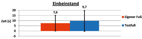 Die statistische Auswertung ergab beim Vergleich der Standzeiten des Einbeinstandes keine signifikanten Unterschiede. Dennoch ließ sich eine Tendenz zugunsten einer Standzeitverlängerung von 28,6 % zugunsten des Testfußes nachweisen (Abb. 5). Beim Balancieren auf dem Balancebrett konnten ebenfalls keine signifikanten Unterschiede festgestellt werden. Beim Balancieren zeigte sich eine Zunahme der erfolgreichen Versuche von 8 auf 10 beim Einsatz des Testfußes.