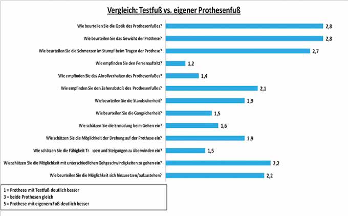 Bessere Leistungen mit dem Testfuß erreichten die Probanden auch bei den Balancetests. Beim Einbeinstand mit dem Testfuß steigerten die Amputierten ihre Standzeit um 2,1 Sekunden. Die hydraulisch gesteuerte Gelenkkonstruktion des Testfußes ermöglichte eine ständige Ausrichtung des Körperschwerpunktes über der hier reduzierten Bodenunterstützungsfläche, ohne dass dies bei Gewichtsverlagerung ein sofortiges Abheben von Ferse oder Fußspitze bzw. ein abruptes Einsetzen des Vorfuß- bzw. Rückfußhebels zur Folge hatte. Es ergab sich dadurch kein extern wirkendes Drehmoment auf die darüber liegende Gelenkkette, was ein sofortiges Ungleichgewicht des Amputierten nach sich gezogen und gegebenenfalls zu einer Gefahrensituation geführt hätte. Somit konnten die Probanden die auftretenden Schwankungen mit dem Testfuß und den noch erhaltenen Teilen des Beines kompensieren und die Ausgleichsbewegungen des Rumpfes verringern. Dies ließ die Amputierten sicherer, effektiver und mit verminderter Wirbelsäulenbelastung stehen. Neben der objektiven Datenerfassung diente der Fragebogen als wichtiges Bewertungsinstrument der getesteten Prothesenfüße. Die Ergebnisse brachten subjektive Vorteile seitens des Testfußes hervor.