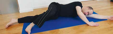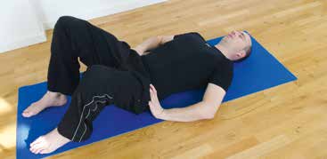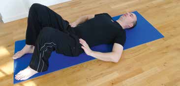 „Liegen Sie auf dem Rücken und stellen die Beine an. Legen Sie die Hände seitlich auf das Becken und führen Sie das Becken langsam in eine Rückwärtspaddelbewegung. Starten Sie langsam damit, die Bewegung muskulär aktiv zu unterstützen. Geht die rechte Beckenseite als Paddel ins Wasser, flacht die Lendenwirbelsäule ab, verlängert sich rechts (macht eine Seitneigung nach links) und hat mit der rechten Seite deutlich Bodenkontakt, während die linke Seite etwas in die Luft kommt. Beim Nachlassen der Aktivität rechts gelangt das Becken wieder in die Mittelposition zurück. Für die linke Seite dann die Bewegung entsprechend durchführen. Vollziehen Sie die Beckenbewegungen klein für die isolierte Mobilisation der Iliosakralgelenke oder etwas größer für die weitergehende Mobilisation der Lendenwirbelsäule. Führen Sie die Bewegungen langsam und kontrolliert aus“ (Abb. 13 u. 14).