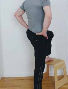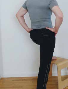 „Stehen Sie mit einem Bein auf dem Boden, das andere stellen Sie auf einen Stuhl, wobei 90 Prozent Ihres Gewichtes auf dem Standbein stehen. Schieben Sie nun den Kopf Richtung Decke und die Ferse des Standbeins in den Boden. Ihr Gewicht bleibt dabei mittig auf dem Fuß. Durch die muskuläre Gesamtaufrichtung der Wirbelsäule richtet sich das Becken auf, und es kippt und dreht zur Standbeinseite. Stellen Sie sich vor, Sie schieben Ihren Körper in einem engen Rohr nach oben. Somit können Sie seitliche Ausweichbewegungen vermeiden“ (Abb. 15 u. 16).