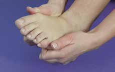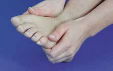 „Sitzen Sie auf dem Boden oder auf einem Hocker und stellen Sie die Ferse auf. Achten Sie darauf, dass Sie mit beiden Händen das Sprunggelenk im ca. 90-Grad-Winkel greifen. Dabei liegen die Hände innen auf dem Großzehenstrahl und außen auf dem Kleinzehenstrahl. Teil 1: Spreizen Sie den Fuß fächerförmig auf, zuerst ohne ihn von den Seiten her einzurollen. Tun Sie dies erst passiv; später unterstützen Sie diese Bewegung aktiv mit der Fußmuskulatur. Teil 2: Rollen Sie jetzt Groß- und Kleinzehenstrahl von außen ein. Tun Sie dies erst passiv; später unterstützen Sie diese Bewegung aktiv mit der Fußmuskulatur“ (Abb. 1 u. 2).