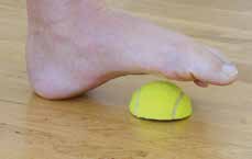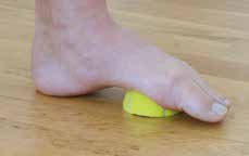 „Sitzen Sie auf einem Stuhl, die beiden Unterschenkel parallel nebeneinander und das Knie senkrecht über dem Sprunggelenk. Legen Sie einen halben Tennisball oder eine halbe Walnussschale unter den mittleren Vorfuß. Die Ferse bleibt am Boden, der Fuß schwebt mit hängenden Zehen über dem Ball. Lassen Sie den Fuß ohne Druck auf den Ball sinken und umgreifen Sie den Ball mit der Groß- und Kleinzehenseite von beiden Seiten. Die Zehen neigen sich dabei langgestreckt nach vorne hinunter. Behalten Sie die Fußposition bei und heben Sie den Vorfuß mit aufgebauter Quergewölbespannung aus dem Sprunggelenk nach oben. Lösen Sie die Spannung wieder auf und lassen Sie den Fuß wieder auf den Ball sinken“ (Abb. 5 u. 6).