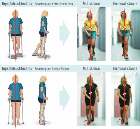 Ist die Orthese nicht vorrangig auf aktives Gehen ausgerichtet oder benötigt der Patient ein erhöhtes Maß an Standsicherheit, ist eine standbezogene Grundstellung zu erwägen. Dabei ruht das Körpergewicht statisch auf beiden Beinen. Beim Gehen mit der fertigen Orthese verläuft die Lotlinie in „mid stance” und „terminal stance” außerhalb der Unterstützungsfläche, und das unter dem Fußteil ansetzende Drehmoment kann in diesen Gangphasen ein mediales Abkippen der Orthese verursachen. Beim Gehen ist – im Gegensatz zum Gehen mit einer Orthese, die auf einer gangbezogenen Grundstellung beruht – die Schrittlänge verkürzt und die Spurbreite vergrößert (Abb. 1).