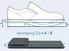 Bei der Ermittlung der individuellen Grundstellung und der daraus resultierenden Gelenkwinkel muss die Tatsache berücksichtigt werden, dass bei Orthesen ein kniesichernder Effekt häufig nur in Wechselwirkung mit der Bodenreaktionskraft – im aufrechten Stand und Gang – erfolgen kann 5. Grundsätzlich bildet der Fuß die Basis für die Ausrichtung der weiter oben liegenden Körpersegmente. Die Ausrichtung des Fußes zum Boden wird maßgeblich durch mögliche Beinlängenverkürzungen und die Schuhsprengung beeinflusst. Als Schuhsprengung wird die Differenz aus in Fersenmitte gemessener Absatzhöhe und im Ballenbereich gemessener Sohlendicke bezeichnet (Abb. 2). Wird diese Differenz erhöht, passt sich in der physiologischen Situation der OSG-Winkel dem höheren Absatz an, ohne die darüber liegende Gelenkkette signifikant zu beeinflussen. Der Unterschenkel-Boden-Winkel verändert sich nicht, allerdings resultiert daraus eine Reduktion des Vorfußhebels. Eine solche Anpassung ist mit einer Orthese nicht möglich, da hier der OSG-Winkel fest eingestellt wird. Bei bestimmten Pathologien liegt eine Bewegungseinschränkung im OSG vor. In diesen Fällen muss die Bewegungsfreiheit des OSG zur Beurteilung des Unterschenkel-Boden-Winkels berücksichtigt werden (siehe Beispiel).