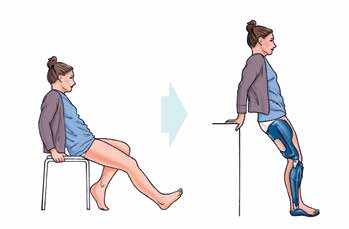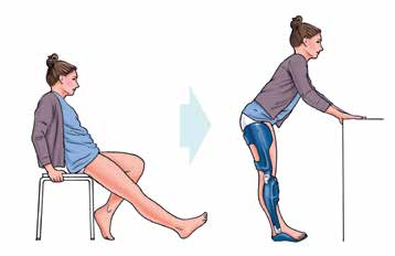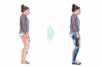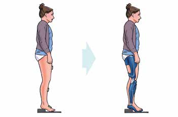 - Der Verkürzungsausgleich wird bis zum physiologischen Unterschenkel-Boden-Winkel durchgeführt. Lässt das verwendete Kniegelenk keine Umbaumöglichkeiten zu, steht der Patient weiterhin im Knie überstreckt. Der Körperschwerpunkt ist insgesamt zu weit vorverlagert und verschiebt sich möglicherweise nach vorne aus der Unterstützungsfläche heraus. Auf die Hüfte wirkt ein flektierendes Moment. Die Standsicherheit ist ohne eine Vergrößerung der Unterstützungsfläche durch Hilfsmittel (z. B. Rollator) herabgesetzt. Einige Gelenke ermöglichen einen Umbau, z. B. durch austauschbare Extensionsanschläge. Dadurch kann die spätere Orthese funktionell einwandfrei sein, jedoch ist dazu ein erhöhter Arbeitsaufwand nötig.