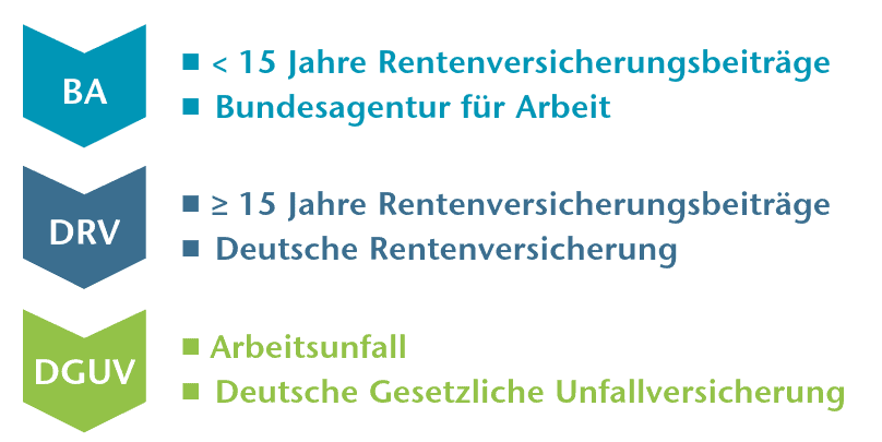 Anhand des Prüfschemas in Abbildung 4 lässt sich für die meisten Versorgungen der Kostenträger schnell ermitteln. Daneben gibt es noch die Sozial- und Integrationsämter und andere kommunale Träger und Einrichtungen. In über 90 % der Fälle ist der Kostenträger jedoch die Deutsche Rentenversicherung. Lässt sich der Kostenträger nicht so leicht ermitteln, so kann ein beliebiger Kostenträger in Anspruch genommen werden. Denn dieser ist verpflichtet, den Antrag zu prüfen und an die entsprechende Stelle weiterzuleiten.