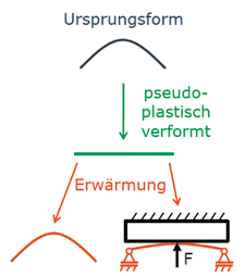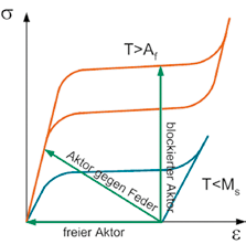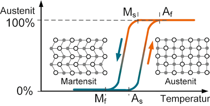 Thermische Formgedächtnislegierungen (FGL) gehören zu den aktiven Werkstoffen und haben die besondere Eigenschaft, nach großer, scheinbar plastischer Deformation ihre Ausgangsform durch Temperaturerhöhung wieder einzunehmen. Wird der Formgedächtniseffekt unterdrückt, indem die Rückstellung verhindert wird, entfaltet das Material entsprechend Abbildung 1 eine externe Kraft und wirkt als Aktor. Häufig kommt Nickel-Titan (NiTi) zum Einsatz, da es biokompatibel eingesetzt werden kann und kommerziell verfügbar ist. Der Temperaturbereich, in dem die Phasenumwandlung vorkommt, wird über das Verhältnis der Legierungsbestandteile und eine Wärmebehandlung eingestellt und kann durch vier charakteristische Temperaturen (Ms, Mf, As, Af) beschrieben werden (Abb. 2) 7.