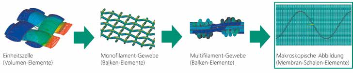 Die Einheitszelle besteht aus Volumen-Elementen und einem repräsentativen Ausschnitt des gesamten Textils. Komplexere Lastzustände lassen sich mit diesem Modellansatz nicht beschreiben 10. Ein größerer Ausschnitt und damit auch mehrachsige Beanspruchungen lassen sich mit dem Monofilament-Gewebe aus Balken-Elementen berechnen 11.