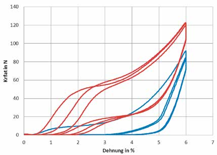Der Kraft-Dehnungs-Verlauf in Abbildung 5 zeigt den Einfluss der FGL-Drähte im Textilverbund, der aus einem Zugversuch experimentell bestimmt wurde. Im aktivierten Zustand (roter Werteverlauf) sind deutlich höhere Kräfte erforderlich, um die Struktur zu dehnen, als beim inaktiven Verbund (blauer Werteverlauf). Dieses stark unterschiedliche mechanische Verhalten kann einerseits dazu eingesetzt werden, die Steifigkeit einer textilen Stützstruktur situationsabhängig einzustellen, andererseits dazu, eine Kompressionskraft zu variieren 12.