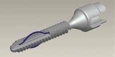 Für eine bestmögliche Nachbildung der physiologischen Lastverhältnisse eines intakten Hüftgelenkes ist die Hüftgelenkskraft möglichst im proximalen Bereich des Schaftimplantates in den umliegenden Oberschenkelknochen einzuleiten. Zur Unterstützung des proximalen Pressfits wurden Prinzipmodelle von Schaftprothesen mit integrierten FGL-Elementen unterschiedlicher Geometrie entworfen (Abb. 7). Gemeinsam mit Medizinern wurde ein Prothesenmodell mit FGL-Blechstreifen auf mindestens drei Seiten des proximalen Schaftbereiches favorisiert, das eine Wirkung sowohl ventral und dorsal als auch medial und lateral erzielen kann. Das entwickelte Implantatkonzept stellt eine Möglichkeit dar, die Kontaktkraft im proximalen Schaftbereich gleichmäßig zu erhöhen und dabei einen unstetigen Kraftverlauf zu vermeiden 13.