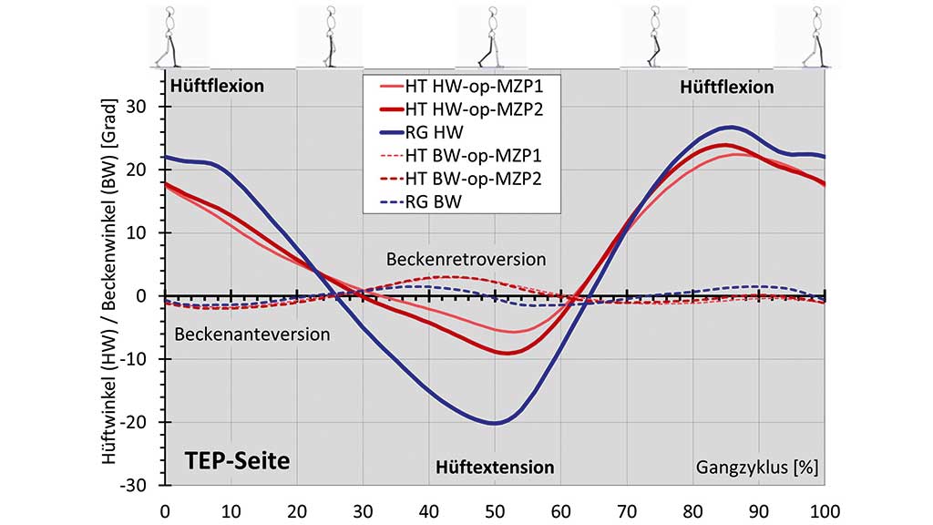 Als Hauptdefizite nach Hüft-TEP werden atypische Gangzyklen, Kraftdefizite und dynamische Gelenksteifigkeit auf der operierten Seite [6], prä- und postoperative Unterschiede in der Kniekinematik6 sowie Atrophien der Muskeln der hüftumgebenden Muskulatur in den ersten zwei Jahren7 berichtet.