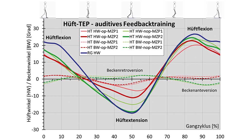 Nach Hüft-TEP zeigt das audFT im Vergleich aller IGs zumindest vom Betrag her die größten Verbesserungen in Geschwindigkeit, Kadenz, Schrittlänge und Standphase, ebenso wie die größten Zunahmen des Bewegungsumfangs in Hüft- und Kniegelenken (Abb. 10) und im Gegensatz zu allen anderen IGs auch keine weitere Zunahme des Beckenwinkels.