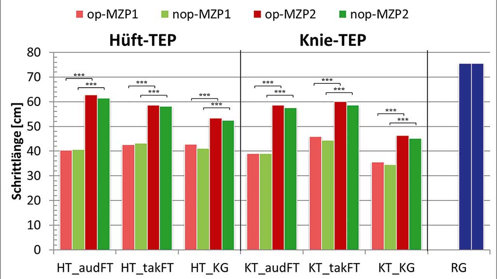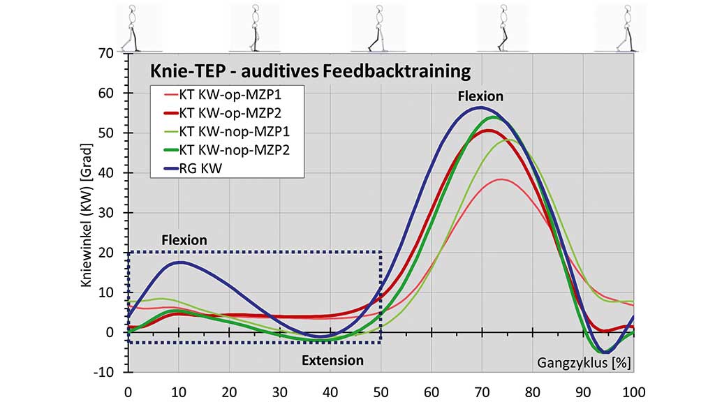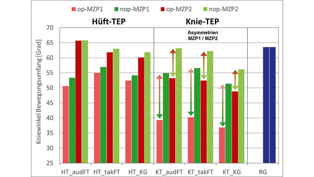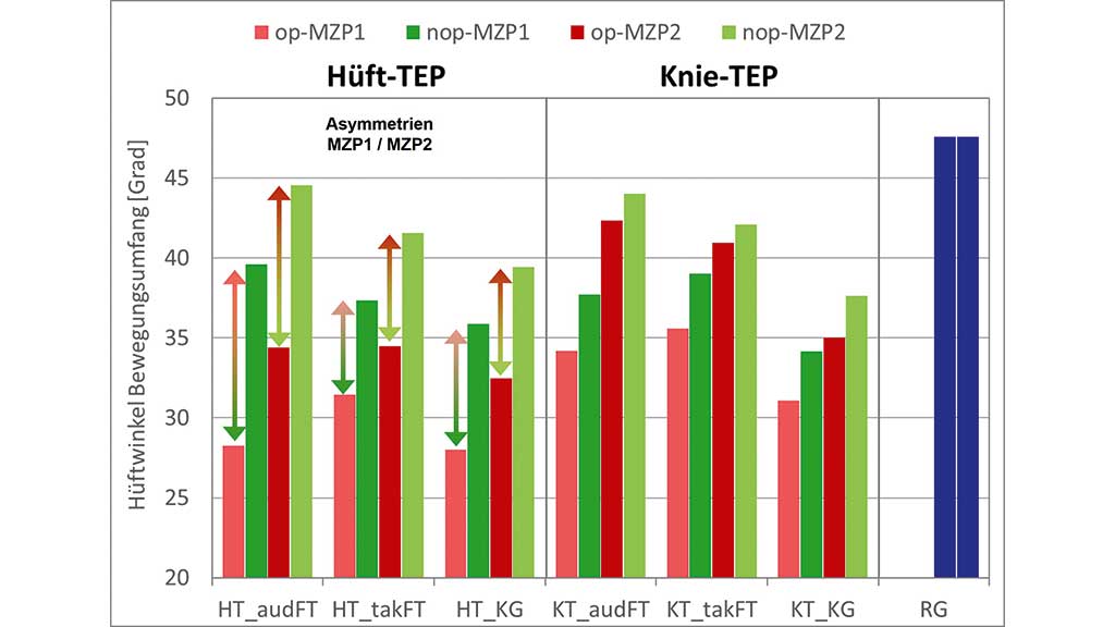 Mit direkter Ansteuerung der Schlüsselparameter nach Hüft-TEP verbessert sich die Flexions-Extensions-Bewegung im Hüftgelenk mit takFT und audFT, es verbleiben jedoch Defizite und Asymmetrien (Abb. 12) zwischen der op- und nop-Seite sowie beidseits im Vergleich zur RG. Auch nach Knie-TEP sind die Flexions-Extensions-Bewegungen mit takFT und audFT in der Fußaufsatz- und mittleren Standphase nur gering verbessert, Defizite sowie Asymmetrien (Abb. 13) zwischen op- und nop-Seite bleiben bestehen, ebenso wie beidseits im Vergleich zur RG.