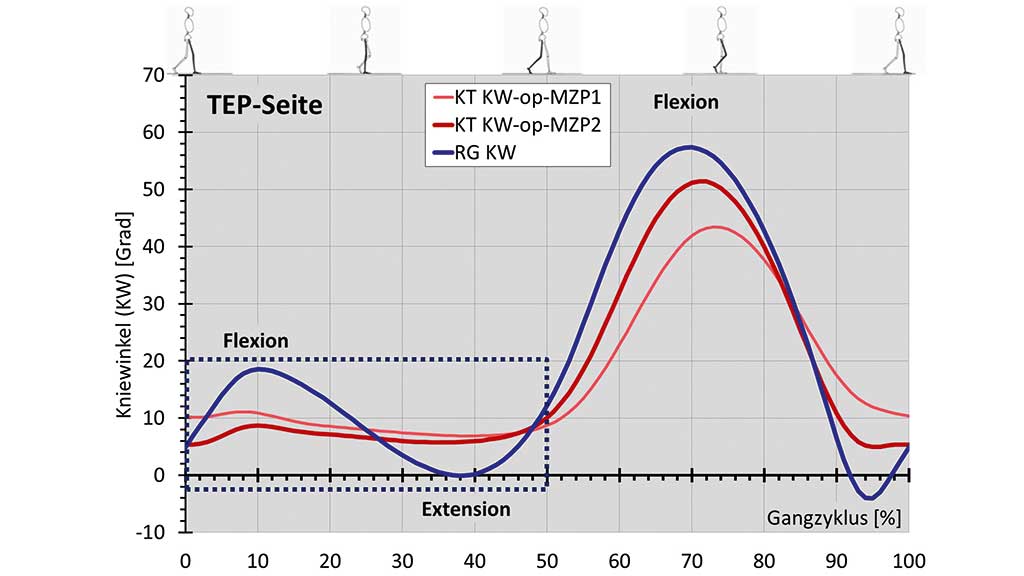 Nach Knie-TEP wurden eine reduzierte oder fehlende Flexions-Extensions-Bewegung8, eine verringerte maximale Kniebeugung während der Gewichtsübernahme9 sowie noch 6 Jahre postoperativ ein Missverhältnis der Extensoren- zur Flexorenkraft zu Ungunsten der Flexoren nachgewiesen10.