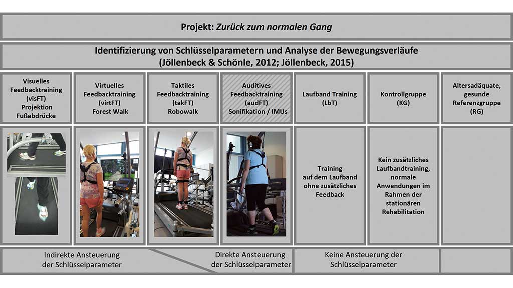 Im Projekt wurden verschiedene Arten der Parametersteuerung getestet und miteinander verglichen (Abb. 3): die indirekte Steuerung, bei der eine Veränderung der Bewegungsverläufe indirekt über eine Anpassung der Schrittlänge angestrebt wird (visFT + virtFT), die unspezifische direkte Steuerung, bei der die Gelenkbewegung beim Gehen durch Zugkräfte unmittelbar beeinflusst wird (takFT), und die spezifische direkte Steuerung, bei der über eine Vertonung der Gelenkwinkel, die dem Patienten online präsentiert wird, eine direkte Beeinflussung des Bewegungsverlaufes angestrebt wird (audFT). Weitere Details zum Gesamtprojekt finden sich in Jöllenbeck/Pietschmann 201935.