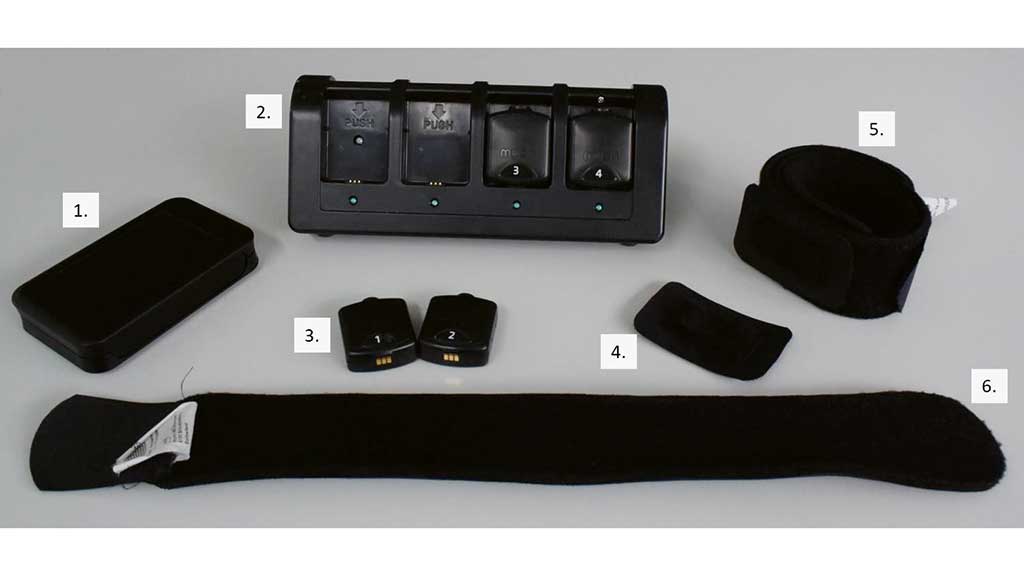 Während des auditiven Feedbacks wurden die Hüft- bzw. die Kniegelenkwinkel an beiden Beinen mit Inertialsensoren gemessen. Bei Hüft-TEP wurden drei Sensoren zur Messung der Hüftwinkel in der Sagittalebene verwendet: ein Sensor an jedem Oberschenkel und ein Sensor am Kreuzbein. Bei Knie-TEP wurden vier Sensoren zur Messung der Kniewinkel in der Sagittalebene verwendet: je ein Sensor an jedem Oberschenkel und an jedem Unterschenkel (Knöchel) (Abb. 5). Jeder Sensor (3,5 cm x 4,4 cm x 1,3 cm, akkubetrieben) wiegt 17 g und kann mit einer passenden Kletttasche auf einem elastischen Neopren-Klettband befestigt werden (Abb. 5 und Abb. 6).